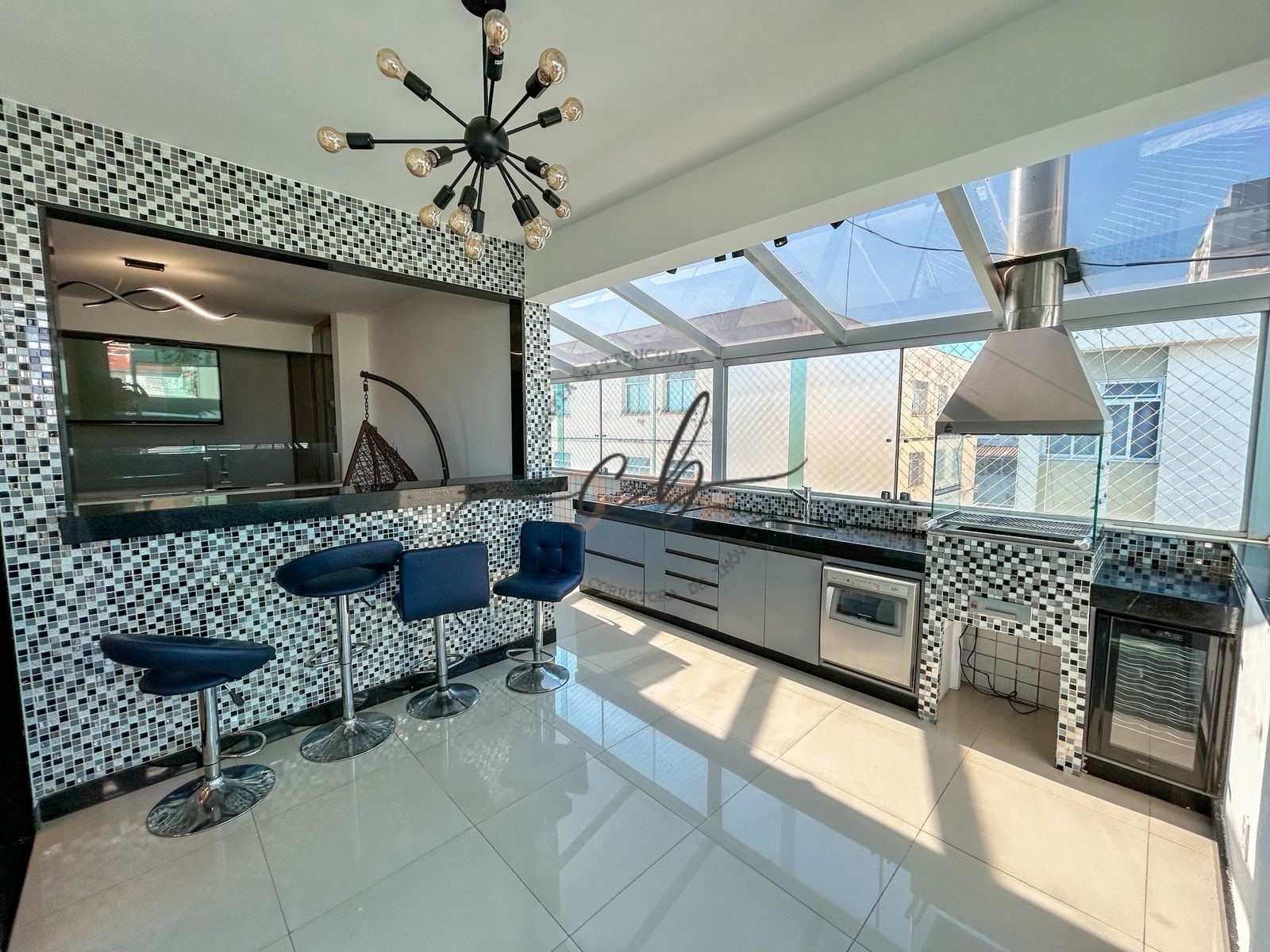 Subindo ao segundo piso, uma escada em granito conduz a uma ampla sala integrada à cozinha gourmet, que conta com churrasqueira, cooktop e bancada em granito, ideal para receber amigos e familiares. A área externa é um verdadeiro refúgio particular, com hidromassagem, deck molhado, toldo transparente e uma vista deslumbrante da cidade — o cenário perfeito para relaxar e apreciar bons momentos.