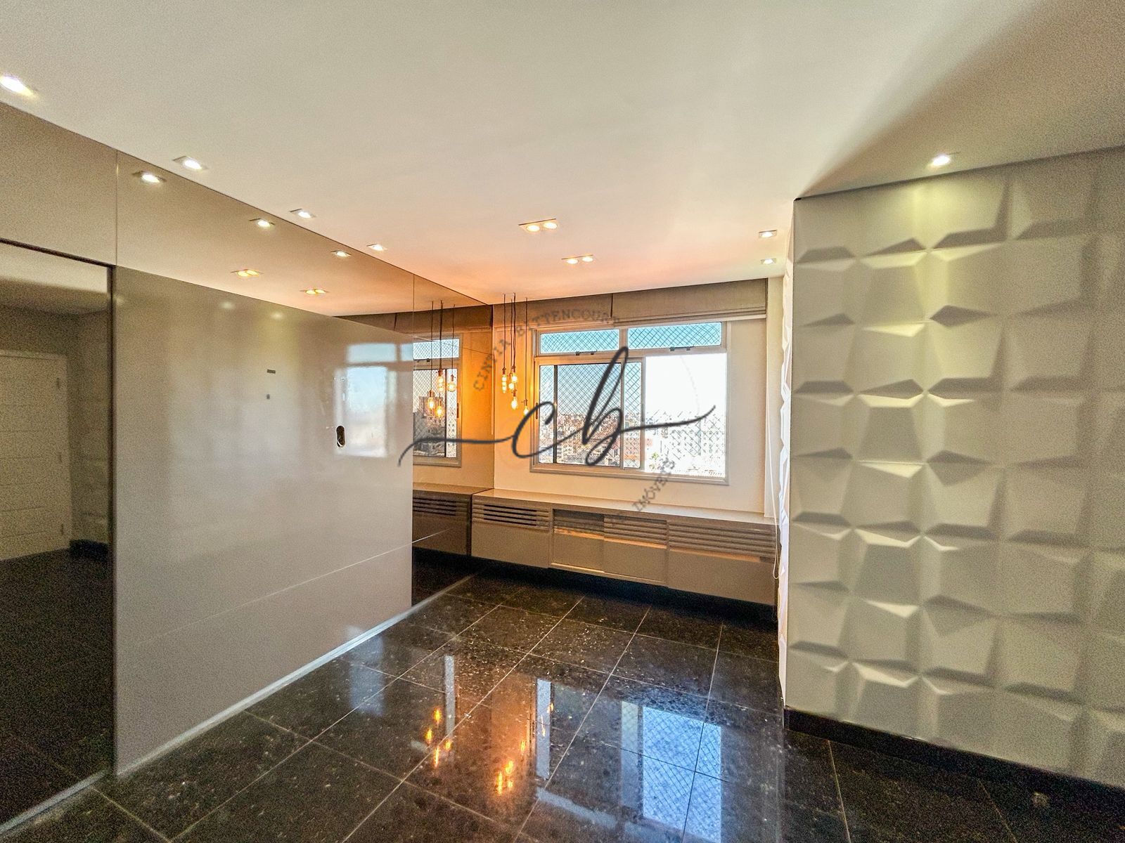 No primeiro piso, são 3 quartos com armários planejados e excelente acabamento, sendo uma suíte. A sala para dois ambientes conta com piso em granito, rebaixamento de gesso, painel em MDF e espelho, criando um ambiente moderno e refinado. A cozinha é totalmente planejada, com armários de ótima qualidade e excelente aproveitamento de espaço.
